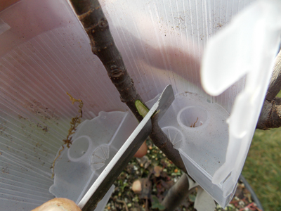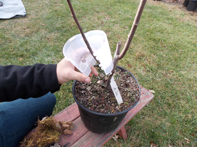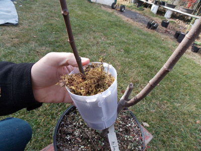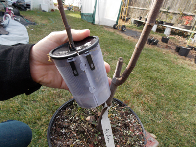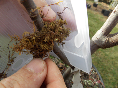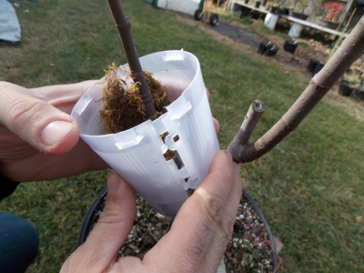 Rooter-Pots clamp around vertical stems from 1/4" up to 1" thick. You make a shallow cut around the stem and peel back the bark, dusting with some rooting hormone. Fill the pot's water reservoirs and close the hinged halves round the stem. Then pack the pot with moistened peat moss, potting mix or our coco-fiber bricks. Place the lid on top and latch into place. Now you have the perfect conditions for new roots to form.